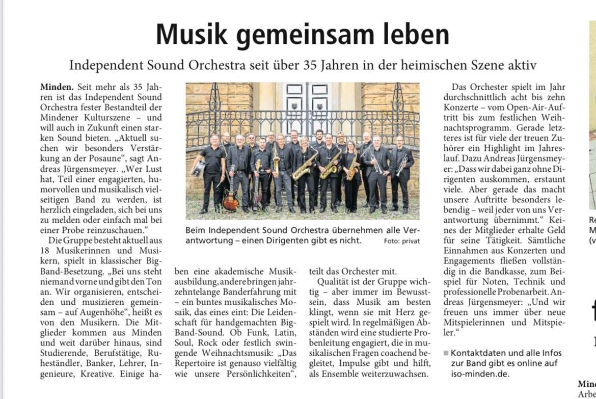 Seit seiner Gründung im Jahr 1988 hat sich das Independent Sound Orchestra als musikalische Institution etabliert. Mit seinem Ursprung im Kreis Minden-Lübbecke ist das Orchester heute ein Aushängeschild der regionalen Musikszene und begeistert weit über die Grenzen Ostwestfalen-Lippes (OWL) hinaus.